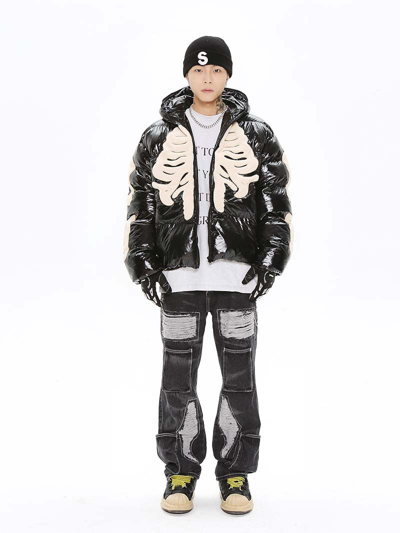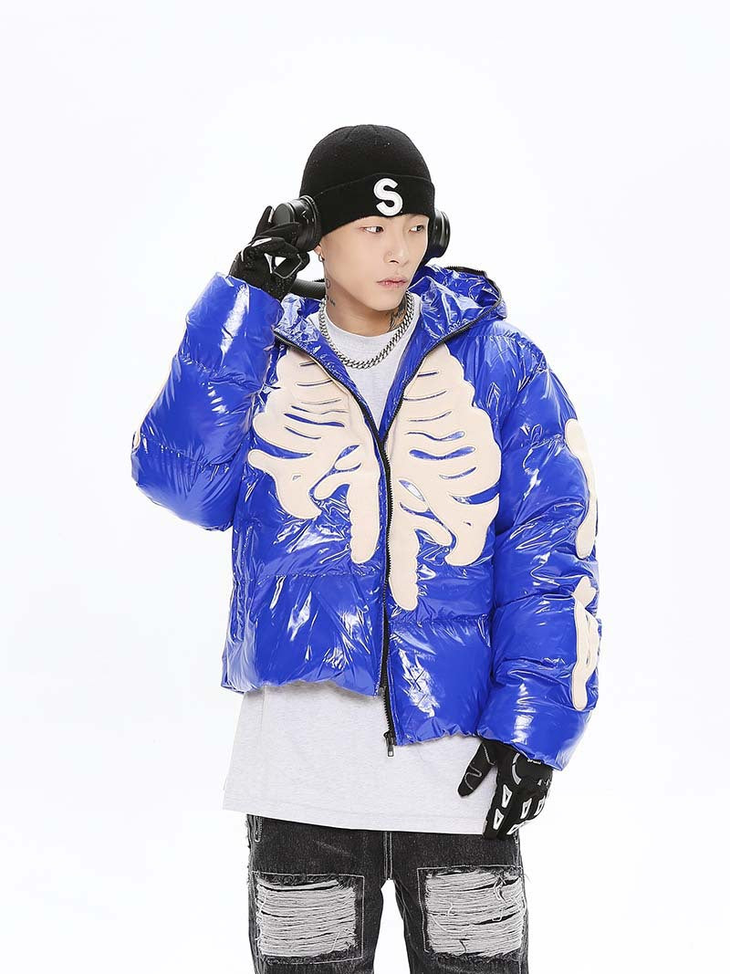 Turn up the attitude this season with the Skeleton Graphic Puffer Jacket where warmth meets bold design. Featuring a high-gloss finish and statement-making skeleton print.