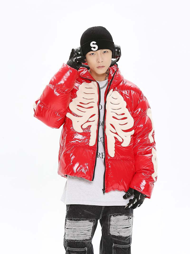 Turn up the attitude this season with the Skeleton Graphic Puffer Jacket where warmth meets bold design. Featuring a high-gloss finish and statement-making skeleton print.