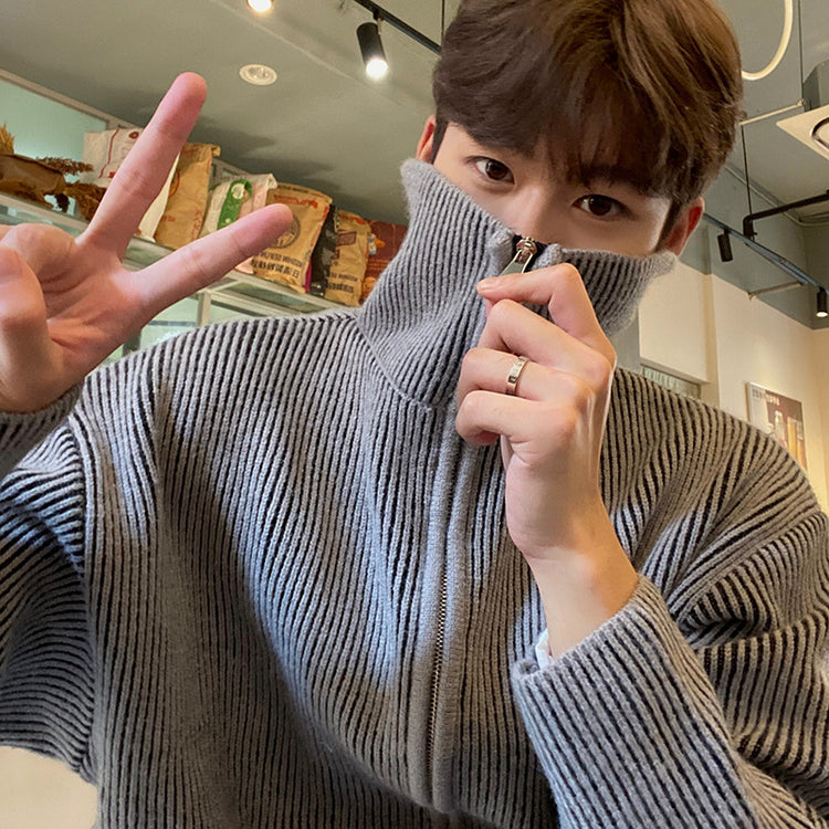 Autumn-winter lazy retro trend with loose striped long-sleeved zipper stand-up collar sweater jacket Korean knitwear trend