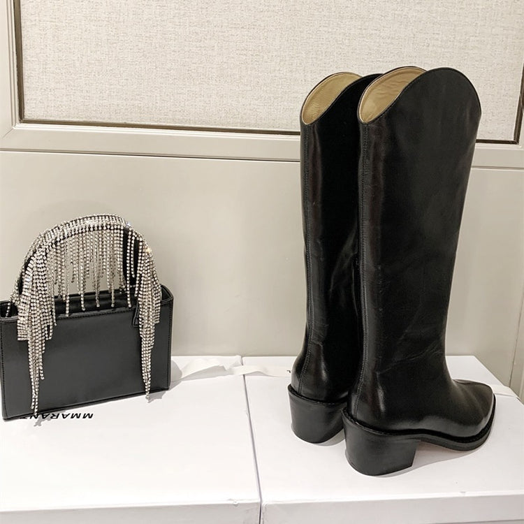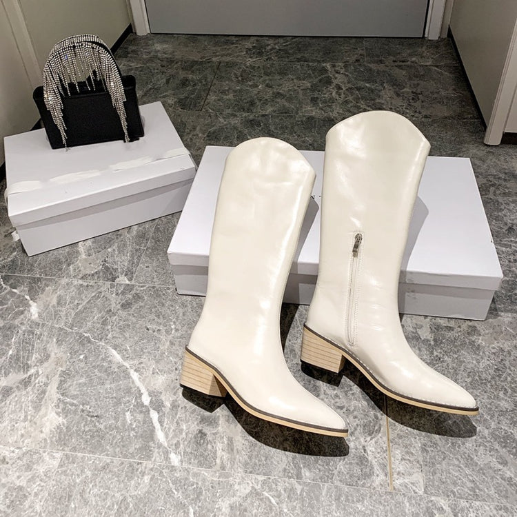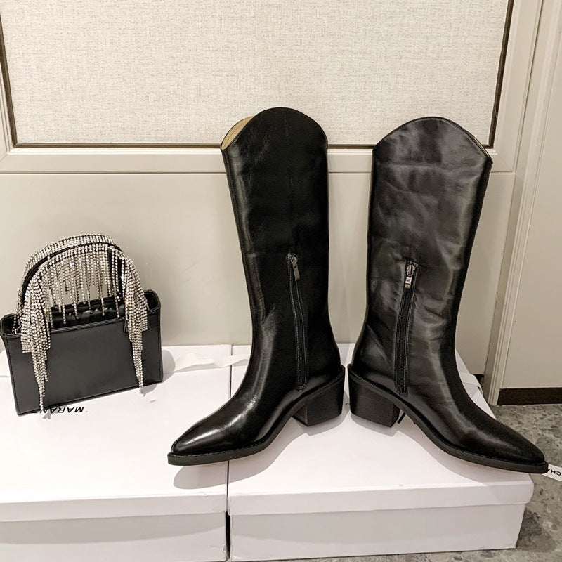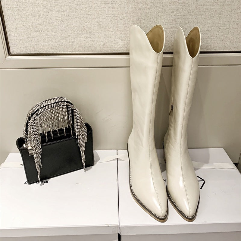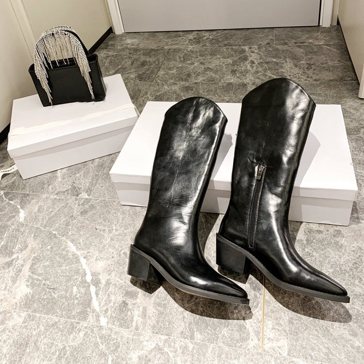V-mouth Leather Thick Heel Western Cowboy Boots Pointed Toe Long Barrel